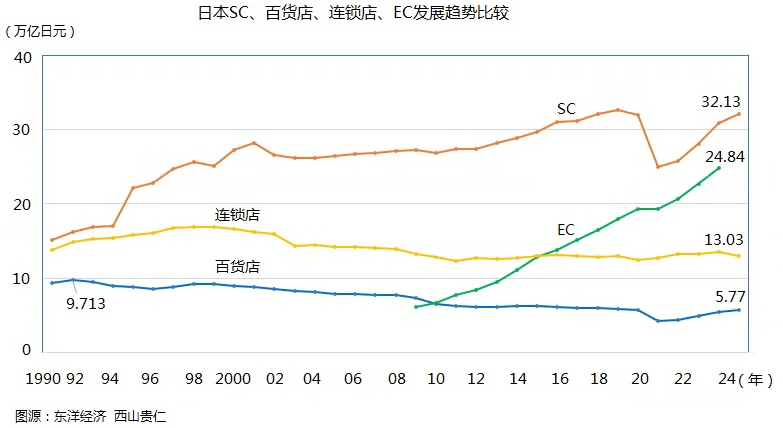 一是EC(電商)帶來(lái)挑戰(zhàn)。EC在購(gòu)物頻道上加速度,對(duì)SC客流量構(gòu)成挑戰(zhàn)。日本的EC平臺(tái)主要是指:Amazon、樂(lè)天市場(chǎng)、ZOZOTOWN、SHEIN、TEMU等。日本媒體、業(yè)界普遍在討論如何解決渠道分流問(wèn)題,雖然不像我們目前這樣寒冷,但是價(jià)值觀的視角趨同。即購(gòu)物的表象下,時(shí)代賦予大眾的生活方式,從被實(shí)體店鋪驅(qū)動(dòng),到主動(dòng)選擇網(wǎng)絡(luò)渠道的服務(wù)內(nèi)容、服務(wù)時(shí)間,包括音頻、視頻、游戲、互動(dòng)體驗(yàn)、醫(yī)藥、金融等,在本質(zhì)上消費(fèi)行為結(jié)構(gòu)已經(jīng)擺脫落后的實(shí)體店束縛。