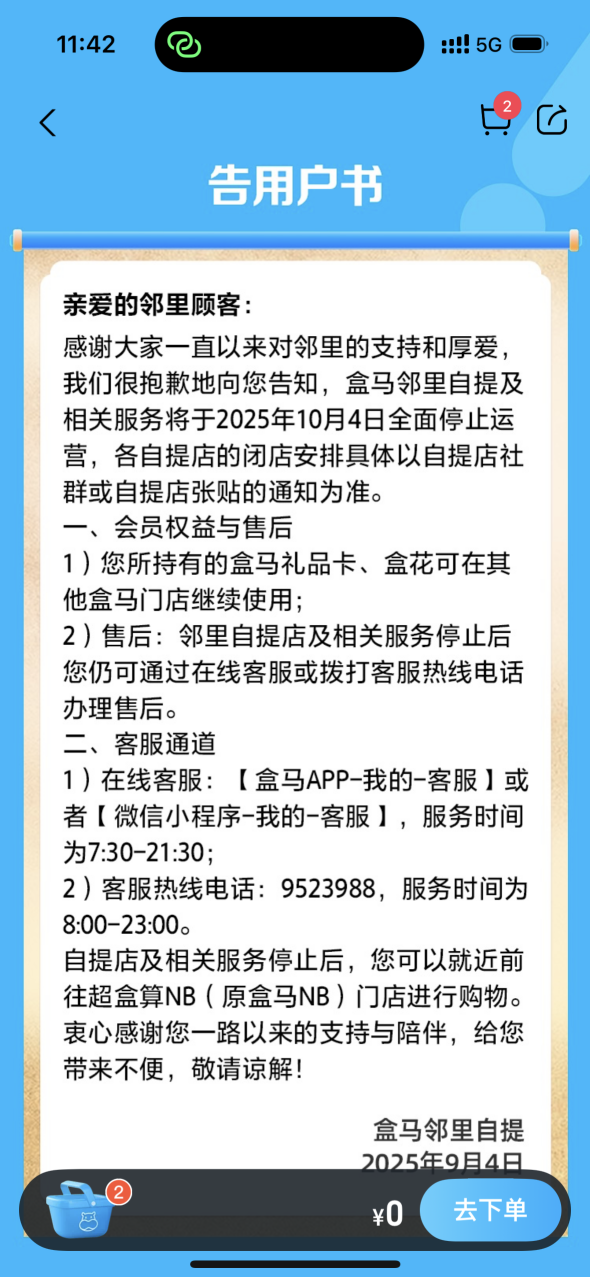 9月4日,部分上海盒馬鄰里用戶收到公告,盒馬鄰里業(yè)務(wù)即將于10月4日停止運(yùn)營。盒馬方面表示,鄰里自提店用戶的需求將由盒馬鮮生和超盒算NB全面承接。用戶持有的禮品卡、盒花等可以在其他盒馬門店繼續(xù)使用,也可以就近前往超盒算NB購物。