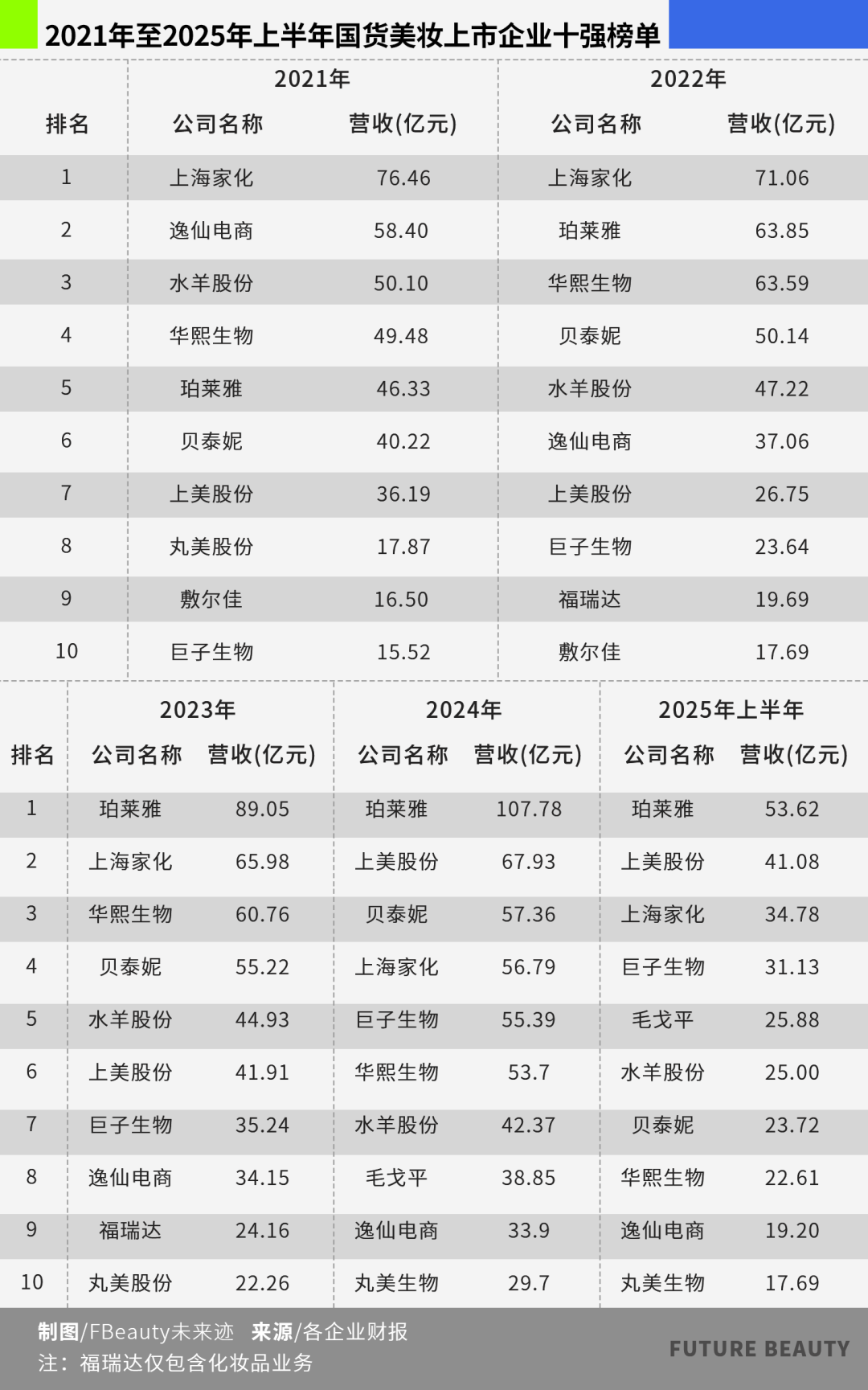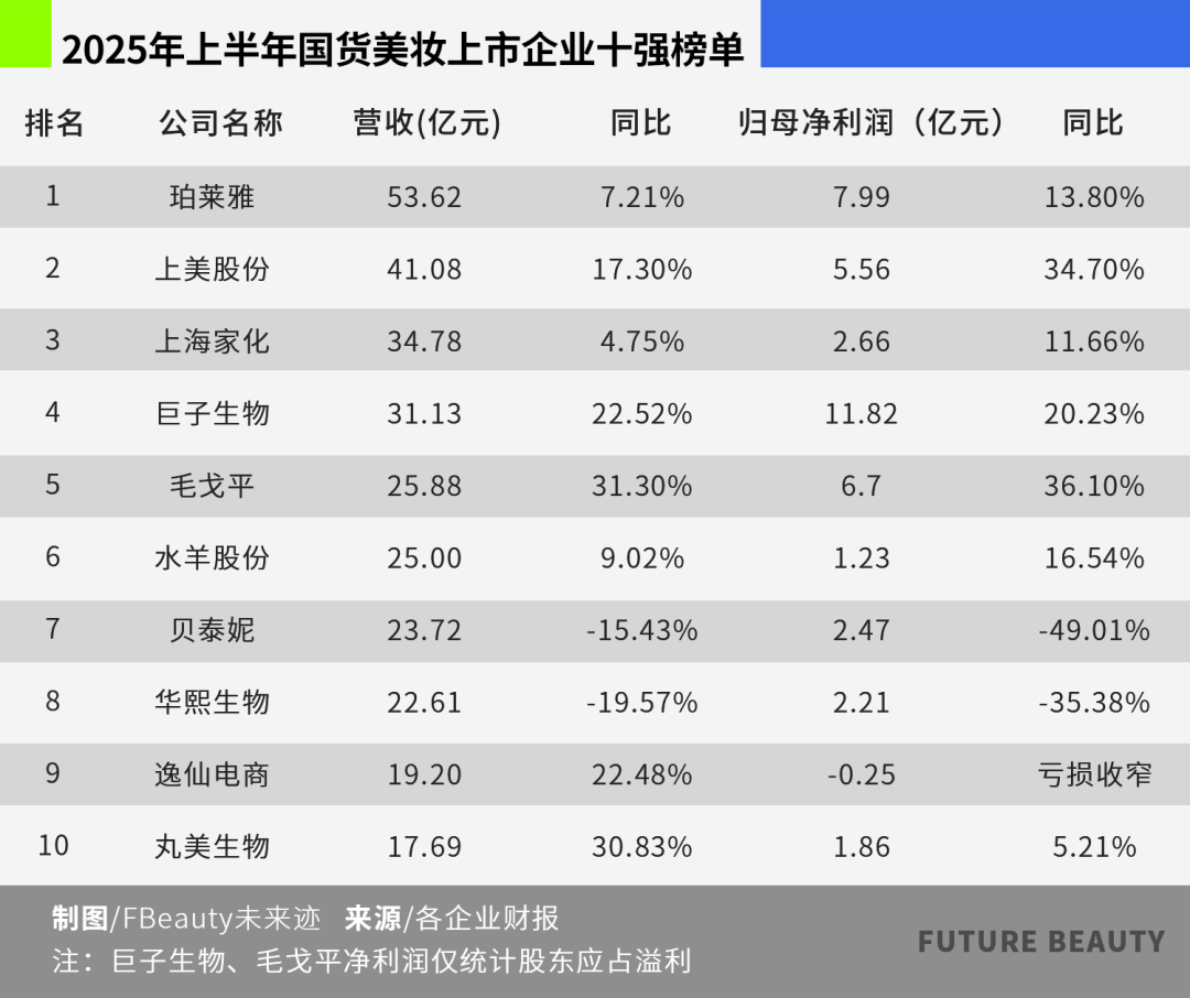 與此同時(shí),隨著各大國(guó)貨美妝上市企業(yè)半年報(bào)的出爐,十強(qiáng)榜單也隨之揭曉。2025上半年國(guó)貨美妝十強(qiáng)財(cái)報(bào),不僅是一張“誰(shuí)賣(mài)得更好”的成績(jī)單,更是一幅頭部企業(yè)緊急謀變、尋找新活法的戰(zhàn)略路線圖。