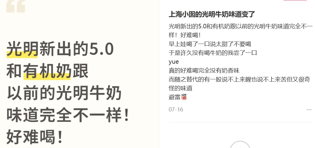 小紅書等社媒平臺上也有不少網(wǎng)友對于光明牛奶食品安全和品控問題的吐槽。此前還有南京便利店工作人員對《江蘇經(jīng)濟(jì)報(bào)》表示,有顧客買的光明牛奶出現(xiàn)變質(zhì)問題,但是業(yè)務(wù)員處理不是很積極,從那之后便減少了光明產(chǎn)品的鋪貨量。
