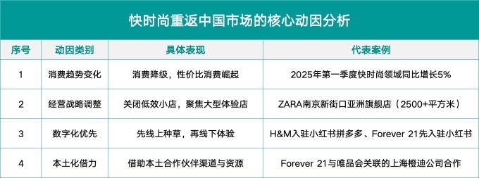 快時尚品牌能夠重返中國市場并實現(xiàn)業(yè)績增長,是多重因素共同作用的結(jié)果: