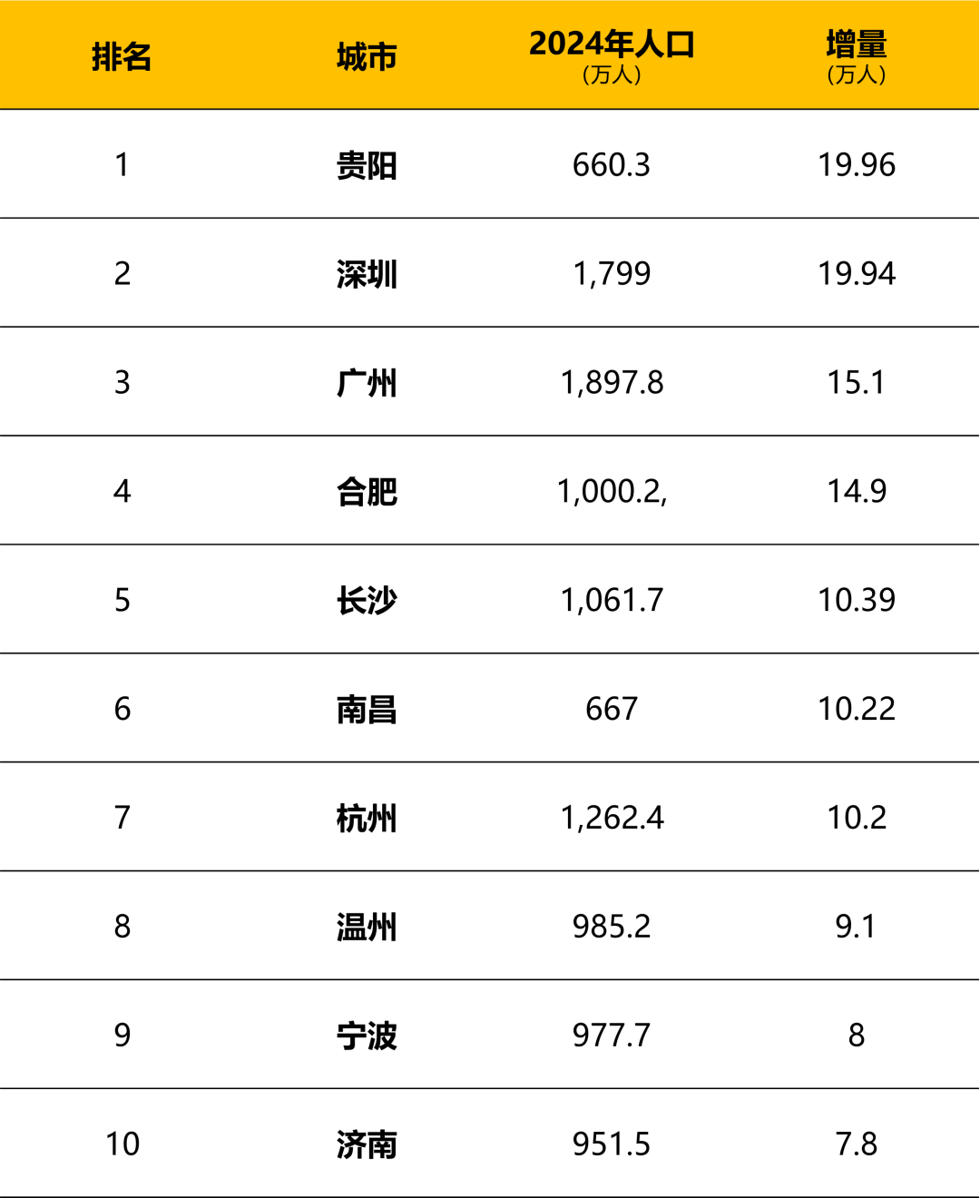 《時(shí)代周報(bào)》統(tǒng)計(jì)的2024年常住人口增量城市前10強(qiáng)