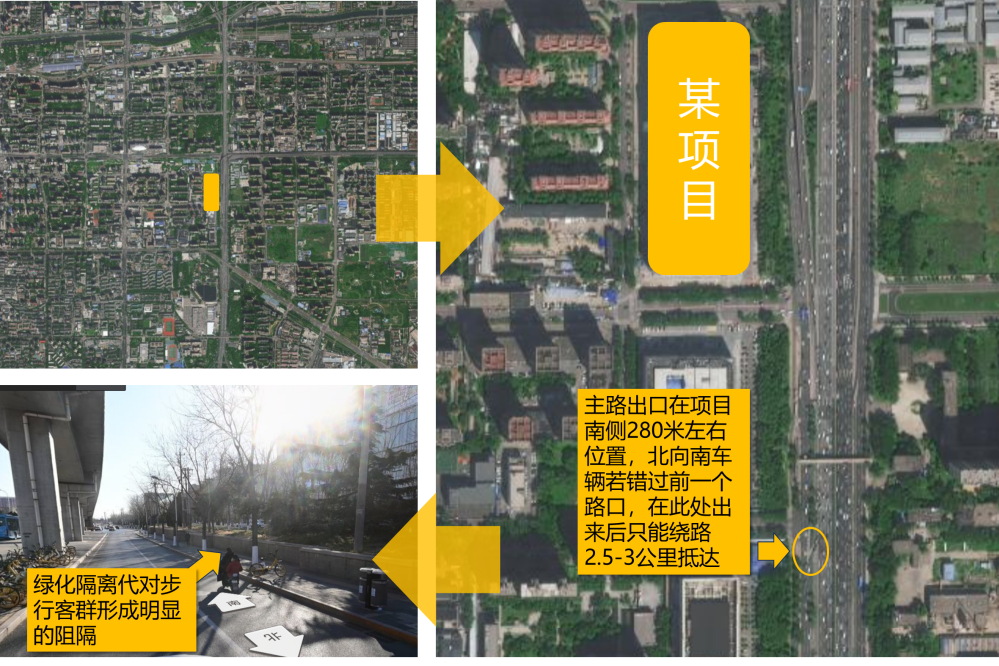 比如下圖某項(xiàng)目的衛(wèi)星圖,看似周邊大環(huán)境無明顯硬傷,但實(shí)際四至交通可達(dá)性存在短板——主路出口距離遠(yuǎn)、綠化帶對(duì)步行客群存在阻隔,這類問題直接導(dǎo)致項(xiàng)目雖然具備較好的外部條件但最后100米內(nèi)客流導(dǎo)入受阻。