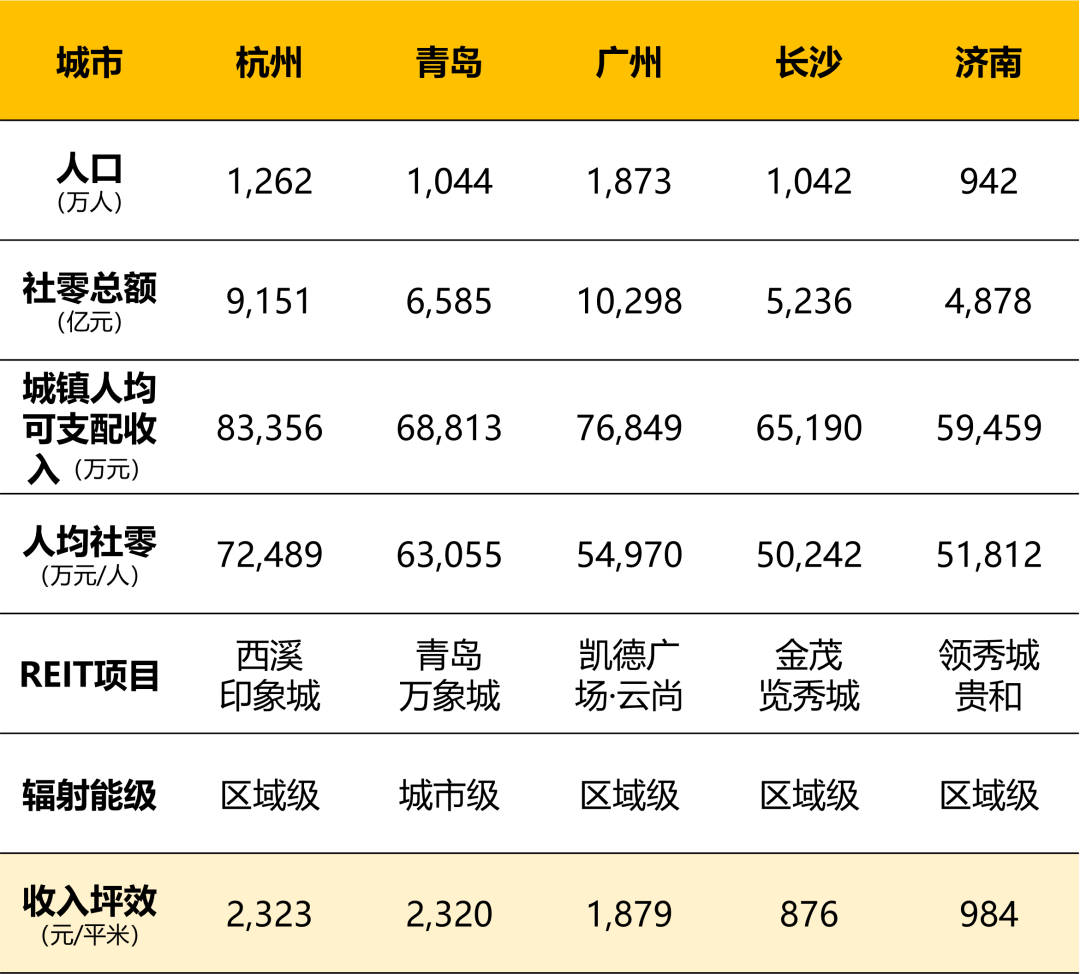 五個(gè)已發(fā)行購(gòu)物中心REITs的城市宏觀數(shù)據(jù)對(duì)比