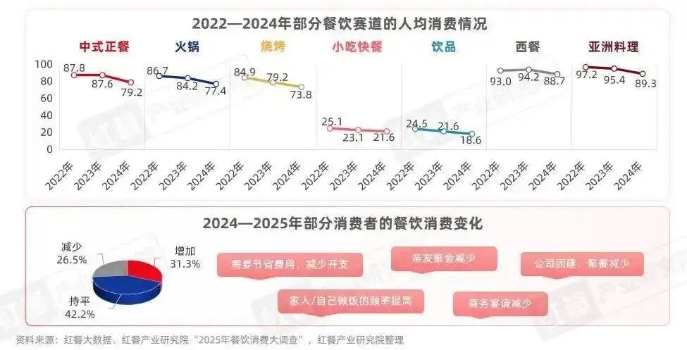 根據(jù)紅餐大數(shù)據(jù)顯示,2024年全國餐飲人均消費(fèi)降至39.8元,同比下降6.6%。在各細(xì)分領(lǐng)域中,飲品賽道的人均消費(fèi)下降幅度最為明顯,降幅達(dá)到13.9%,中式正餐、火鍋、燒烤、小吃快餐等其他細(xì)分賽道的人均消費(fèi)也均有不同幅度的下降。