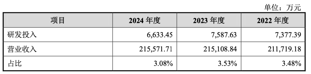招股書顯示,2022年至2024年,植物醫(yī)生研發(fā)投入分別為7377.39萬元、7587.63萬元、6633.45萬元,占營業(yè)收入的比例分別為3.48%、3.53%、3.08%。