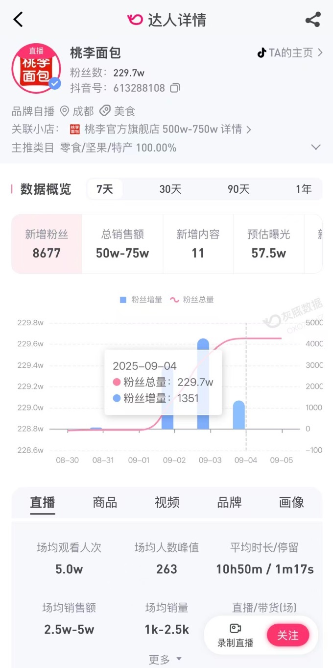 不過,從抖音賬號(hào)粉絲數(shù)與直播間銷售額看,說教式文案未對(duì)桃李面包銷售帶來沖擊;译鄶(shù)據(jù)顯示,9月2日至4日,桃李面包抖音賬號(hào)粉絲整體呈上升趨勢(shì),近7天內(nèi)新增粉絲8677人。9月3日、4日,桃李面包直播間銷售額均為10萬元至25萬元,系品牌近30天來銷售額的峰值。