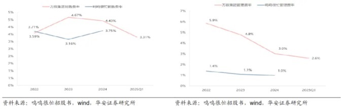 2024年公司管理費(fèi)用高達(dá)9.8億元、銷售費(fèi)用14.3億元,分別是2022年的30倍與71倍。管理費(fèi)率3.0%,高于行業(yè)中同為萬店體量鳴鳴很忙的1.0%。