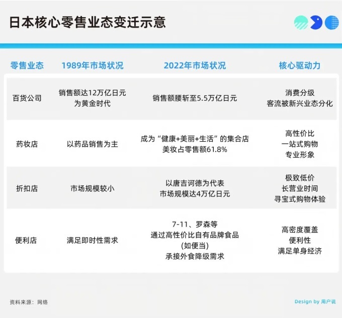 消費行為的變化直接催生了零售渠道的結(jié)構(gòu)性革命。曾經(jīng)作為消費地標(biāo)的百貨商店,在這場變革中首當(dāng)其沖。根據(jù)日本百貨店協(xié)會的數(shù)據(jù),其銷售額從1989年的12萬億日元,腰斬至2022年的5.5萬億日元。為了求生,百貨公司不得不將更多的空間讓渡給“剛需”的食品,其銷售占比從20.6%提升至29.3%。