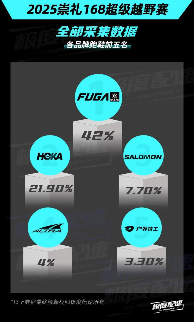 極度配速統(tǒng)計數(shù)據(jù)顯示,在今年的崇禮168超級越野賽上,凱樂石FUGA以42%的比例成為全場越野跑鞋穿著占比最高的運動品牌。HOKA和薩洛蒙分別以21.9%和7.7%的占比分別位居第二、第三。