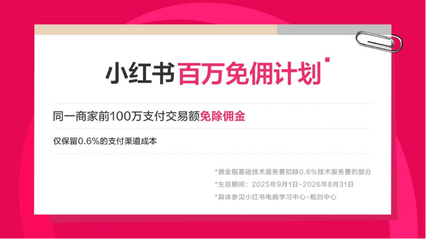 除此以外,小紅書電商還發(fā)布了“百萬免傭計劃”,將從前2%-5%左右的傭金費率普遍降低到了0.6%,且商家無需申請,其傭金會在服務(wù)費結(jié)算時被自動減免。