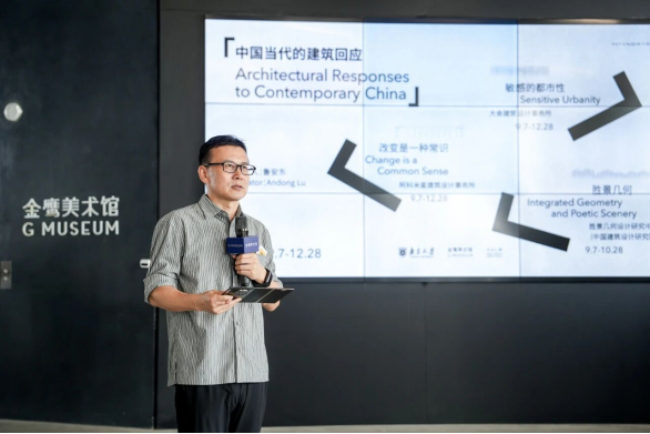 ■《中國當代的建筑回應》展覽現(xiàn)場,勝景幾何設計研究中心李興鋼致辭。
