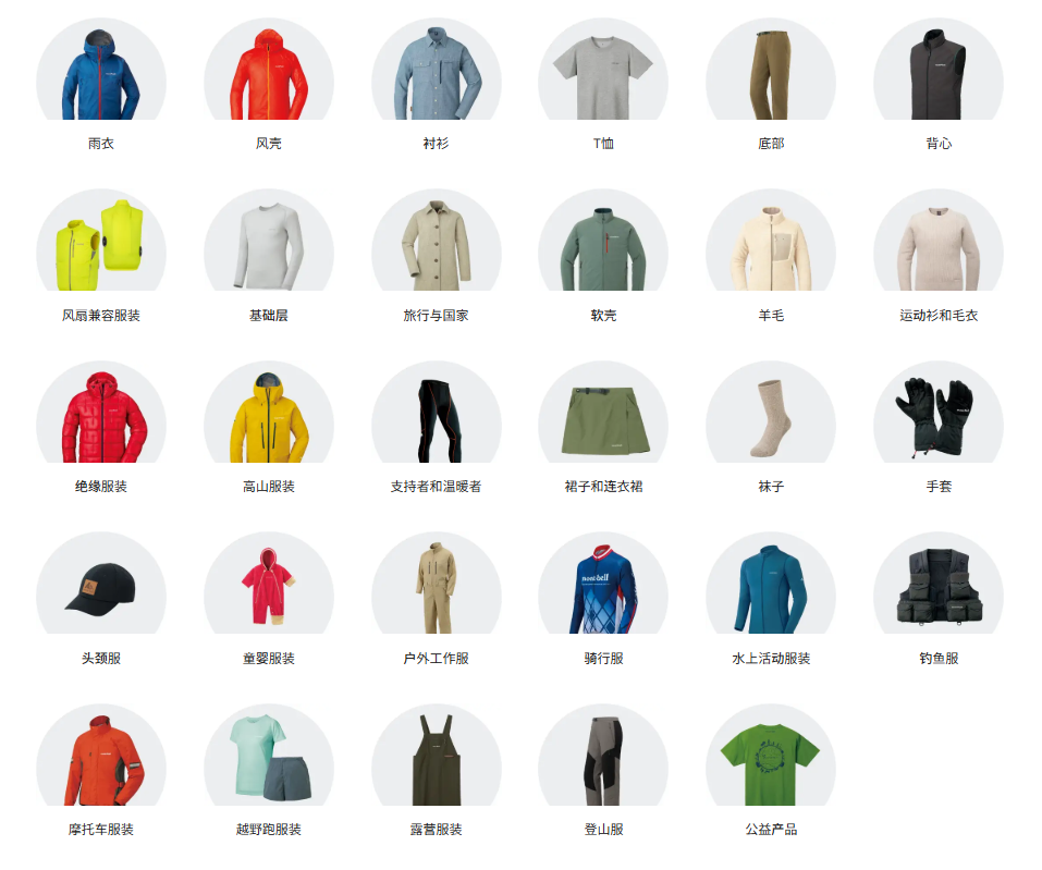 首先,montbell并非專注于某個品類支線,而是提供豐富的產(chǎn)品線,包括羽絨服、沖鋒衣、抓絨衫、登山包、抓絨圍巾、防曬衣、保溫杯等,覆蓋了滑雪、登山、徒步、露營、騎行、攀巖、釣魚等大部分戶外運動。