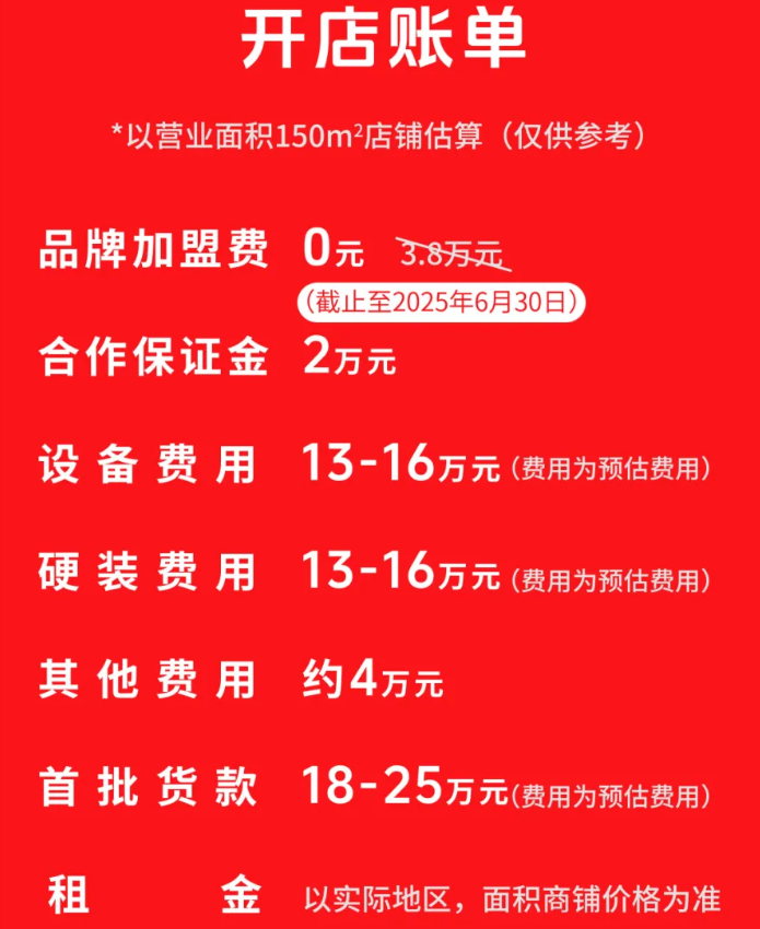 而加盟商面臨著“收入降、成本升”的雙重?cái)D壓。開(kāi)設(shè)一家好想來(lái)門店,不含房租、人工等,前期需要投資約50萬(wàn)元,包括2萬(wàn)元保證金、13萬(wàn)元裝修費(fèi)、13萬(wàn)元設(shè)備費(fèi)、18萬(wàn)元首批貨款、4萬(wàn)元其他費(fèi)用等。