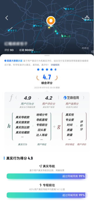 具體而言,掃街榜的榜單評(píng)分主要基于兩部分?jǐn)?shù)據(jù)構(gòu)成:行為+信用,可以理解為:“身體力行”和“言而有信”!吧眢w力行”是指包括導(dǎo)航、搜索、到店,以及多次前往、專程前往等真實(shí)行為,體現(xiàn)多維度的“用腳投票”!把远行拧眲t是利用AI能力提升識(shí)別和過(guò)濾虛假信息,再通過(guò)引入芝麻信用體系,讓高德掃街榜的評(píng)價(jià)信用體系能夠結(jié)合用戶的信用等級(jí),進(jìn)一步提升評(píng)價(jià)可信度。