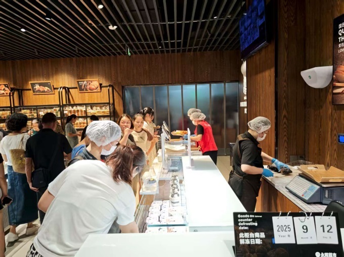 熟食烘焙區(qū)同樣誠意滿滿,調(diào)改后比例從5%增至15%。其中熟食區(qū)主推的芝士牛肉卷,以安格斯牛肉與馬蘇里拉芝士打造超長拉絲和酥脆外皮;雙匯鹵甜腸復(fù)刻胖東來同款網(wǎng)紅風(fēng)味,含肉量超80%,每日現(xiàn)煮現(xiàn)賣,口感Q彈;此外還有奧爾良烤雞、北京烤鴨等經(jīng)典品類。烘焙區(qū)則聚焦高品質(zhì)糕點(diǎn),如香蔥松松卷、榴蓮大福、爆漿馬斯卡彭蛋糕和虎皮麻薯罐子蛋糕,滿足年輕人與家庭對(duì)甜品的升級(jí)需求。