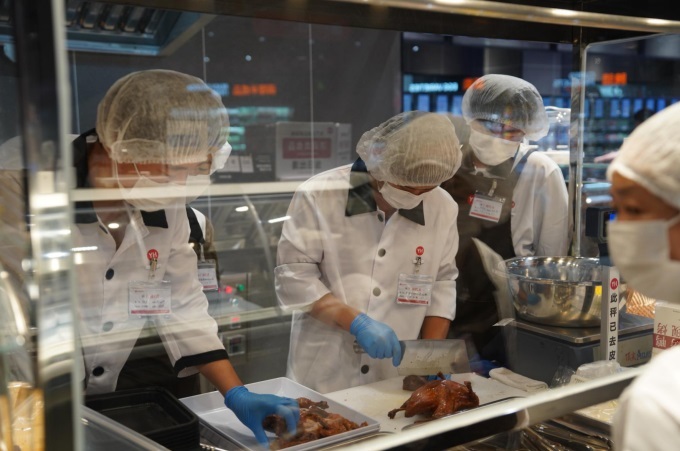 步入熟食烘焙區(qū),各類檔口煙火氣十足,F(xiàn)場(chǎng)制作的鮮肉包、鮮肉餅、烤雞、炸水餃等香氣四溢,剛出爐的烤鴨泛著油亮的光澤,最引人駐足的當(dāng)屬小龍蝦專柜,新鮮出鍋的小龍蝦堆成"紅霞山",麻辣、蒜香、十三香等三種口味供消費(fèi)者選擇。烘焙工坊實(shí)現(xiàn)了從無(wú)到有的跨越,自制SKU增加至50支,所有原料嚴(yán)格執(zhí)行“不使用代可可脂、氫化植物油”等健康標(biāo)準(zhǔn),確保品質(zhì)安心。