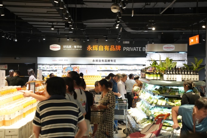 門店取消強(qiáng)制動(dòng)線,大幅拓寬通道,中島貨架高度由2-2.4米降至1.6米,層數(shù)由8-9層精簡(jiǎn)至5-6層,整體布局更開闊通透。同步設(shè)置胖東來和永輝自有品牌商品專區(qū),增強(qiáng)賣場(chǎng)品牌氛圍與購(gòu)物活力。