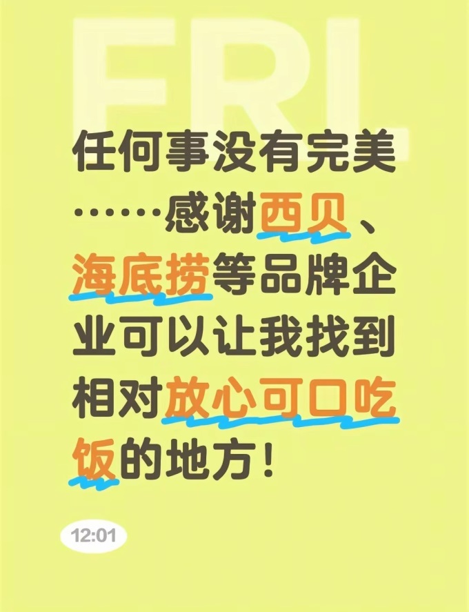 9月12日,胖東來(lái)創(chuàng)始人于東來(lái)在社交媒體發(fā)文表示:“任何事沒(méi)有完美......感謝西貝、海底撈等品牌企業(yè)可以讓我找到相對(duì)放心可口吃飯的地方!”