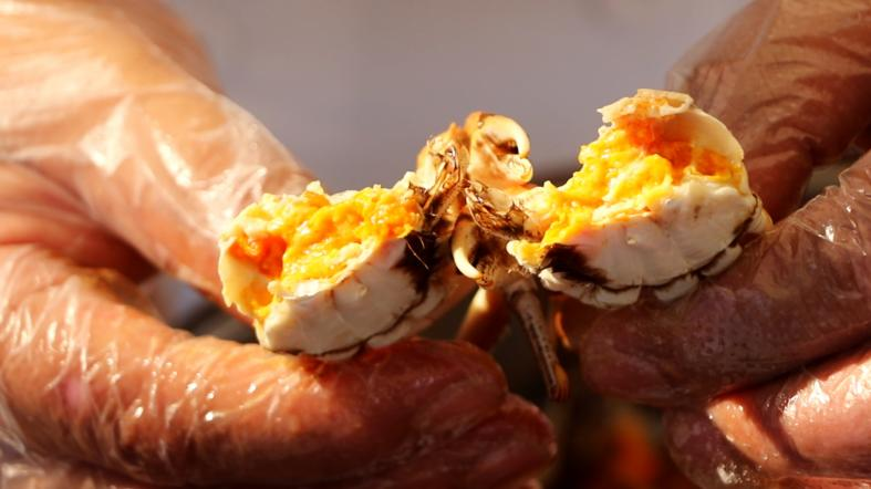盤錦河蟹是國家地理標志產(chǎn)品,因其“肉質(zhì)鮮嫩、風味獨特、膏滿黃多、野味十足”而享譽全國。盤錦地處遼河入?,海淡水交匯形成的廣袤葦?shù)緷竦兀S富的天然餌料和獨特環(huán)境成就了其卓越品質(zhì)。因緯度高,晝夜溫差大,野生散養(yǎng)的河蟹經(jīng)過長達6個月的越冬期,更有利于營養(yǎng)積累,形成獨特風味。