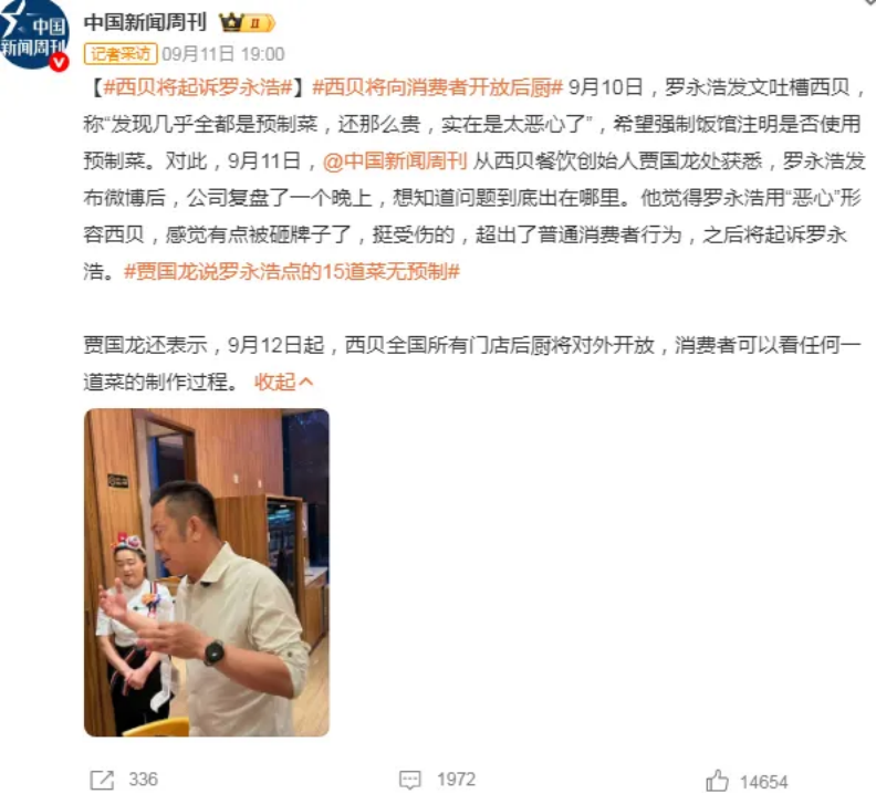 9月10日,羅永浩與四位同事在北京中糧祥云小鎮(zhèn)的西貝門店用餐,五人點(diǎn)了13道菜。餐后,他在微博吐槽:“好久沒吃西貝了,今天下飛機(jī)跟同事吃了一頓,發(fā)現(xiàn)幾乎全都是預(yù)制菜,還那么貴,實(shí)在是太惡心了!蓖瑫r(shí),他呼吁國家盡早推動立法,強(qiáng)制飯館注明是否用了預(yù)制菜。此微博迅速引發(fā)熱議,話題#羅永浩吐槽西貝#閱讀量飆升至數(shù)千萬。