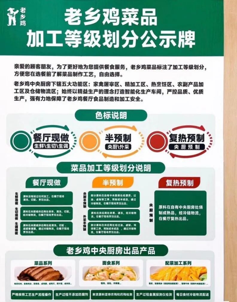 第二,老鄉(xiāng)雞在門店公示菜品的加工分類,用顏色區(qū)分來強(qiáng)化消費(fèi)者識別。在老鄉(xiāng)雞的門店內(nèi),設(shè)有醒目標(biāo)識,將菜品的加工方式分為三類:綠色代表餐廳現(xiàn)做,比如生鮮、生制類菜品;黃色代表半預(yù)制,比如廚房自制或外采的半熟食材如預(yù)處理好的肉塊;紅色代表復(fù)熱預(yù)制,即經(jīng)中央廚房制作后冷鏈配送至門店、需加熱食用的產(chǎn)品如部分包子、米飯。就連羅永浩在2025年的直播中,也提到了這一點(diǎn)。
