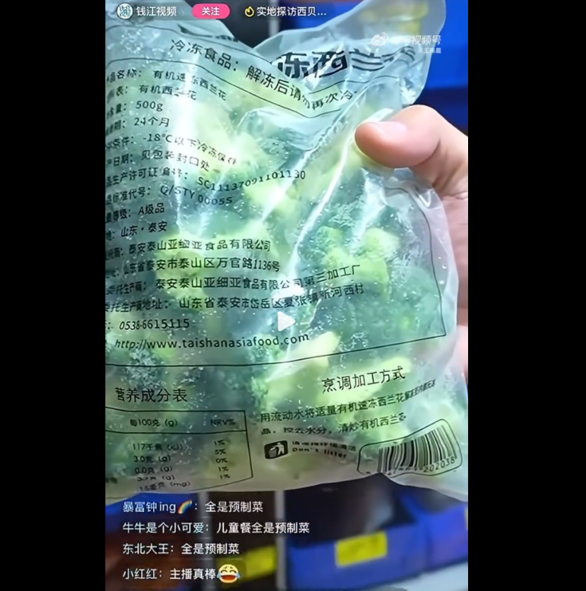 雖然西貝的直播里出現(xiàn)了提前腌制好的魚、保質(zhì)期兩年的西蘭花等冷凍食材,但這些都不屬于官方定義的預(yù)制菜范疇。