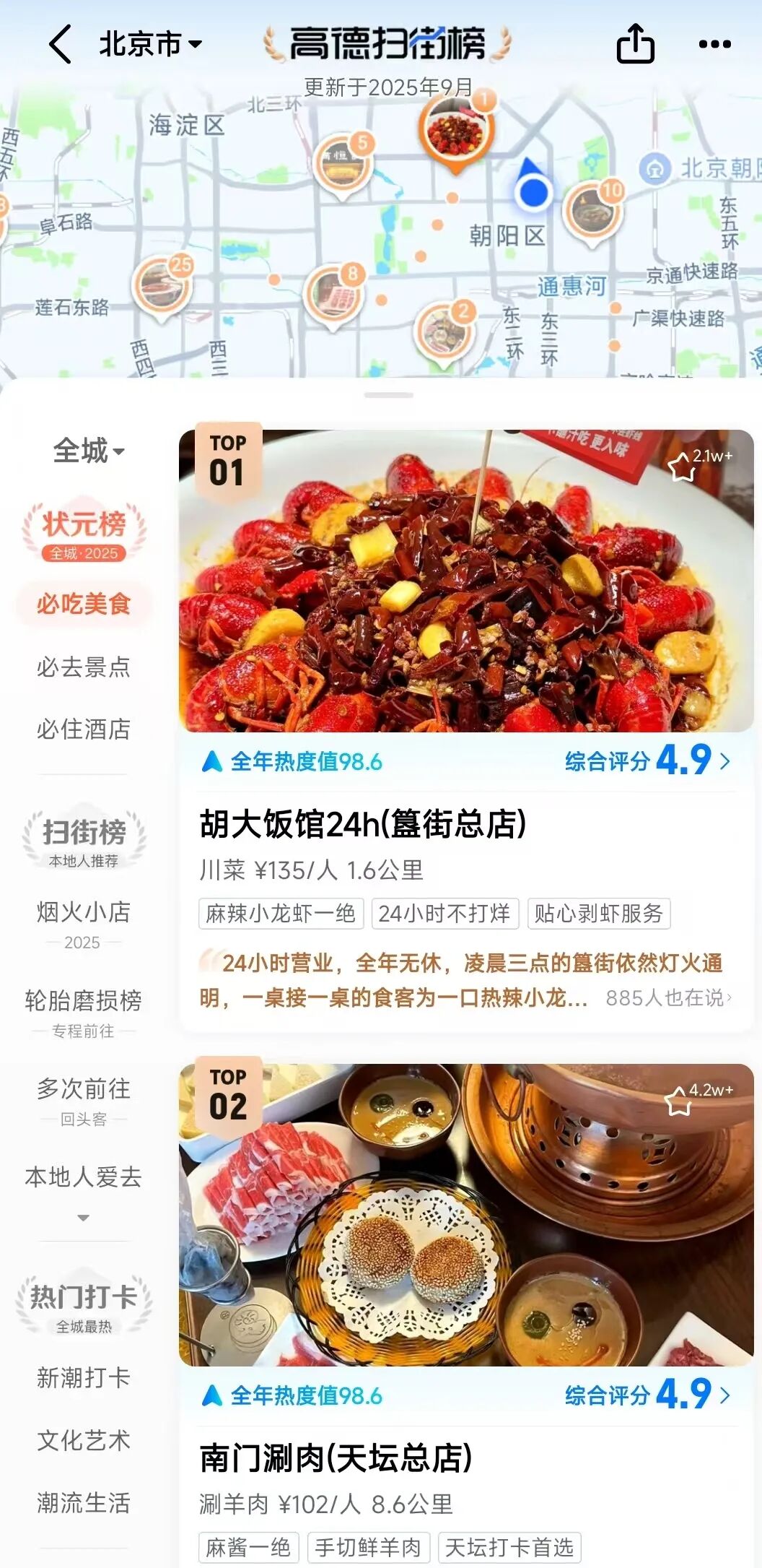 結(jié)果就是發(fā)布了對(duì)標(biāo)美團(tuán)大眾點(diǎn)評(píng)榜單的“高德掃街榜”,對(duì)商家進(jìn)行綜合評(píng)分、排名,涵蓋美食、景點(diǎn)、酒店等多種業(yè)態(tài)。