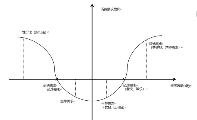 因?yàn)椴煌芷谙孪M(fèi)者對(duì)于商業(yè)的需求是不同的,從求生存到享精神,對(duì)應(yīng)不同消費(fèi)層面,以及支付能力(見圖一)。