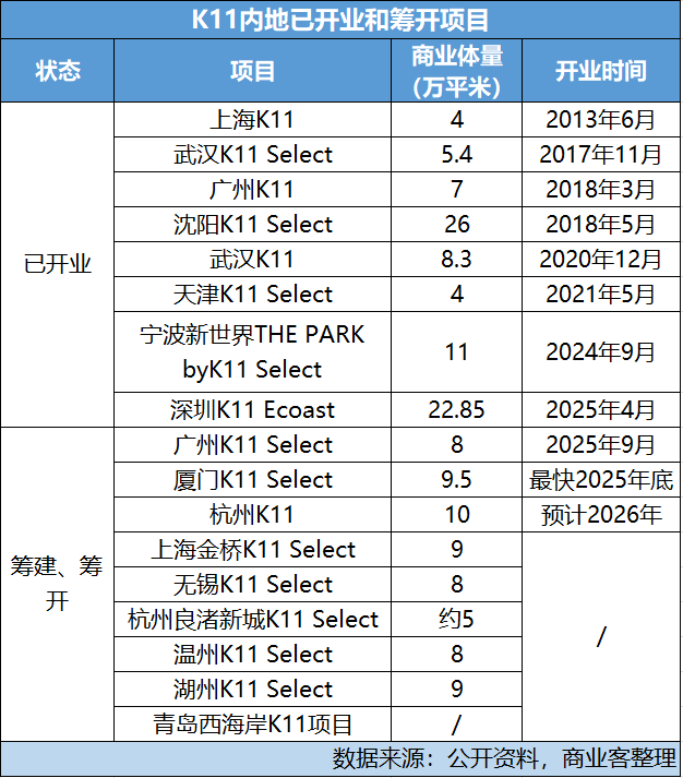 截至目前,“K11”品牌已開業(yè)運營的項目為8個,籌建、籌開的項目有9個。