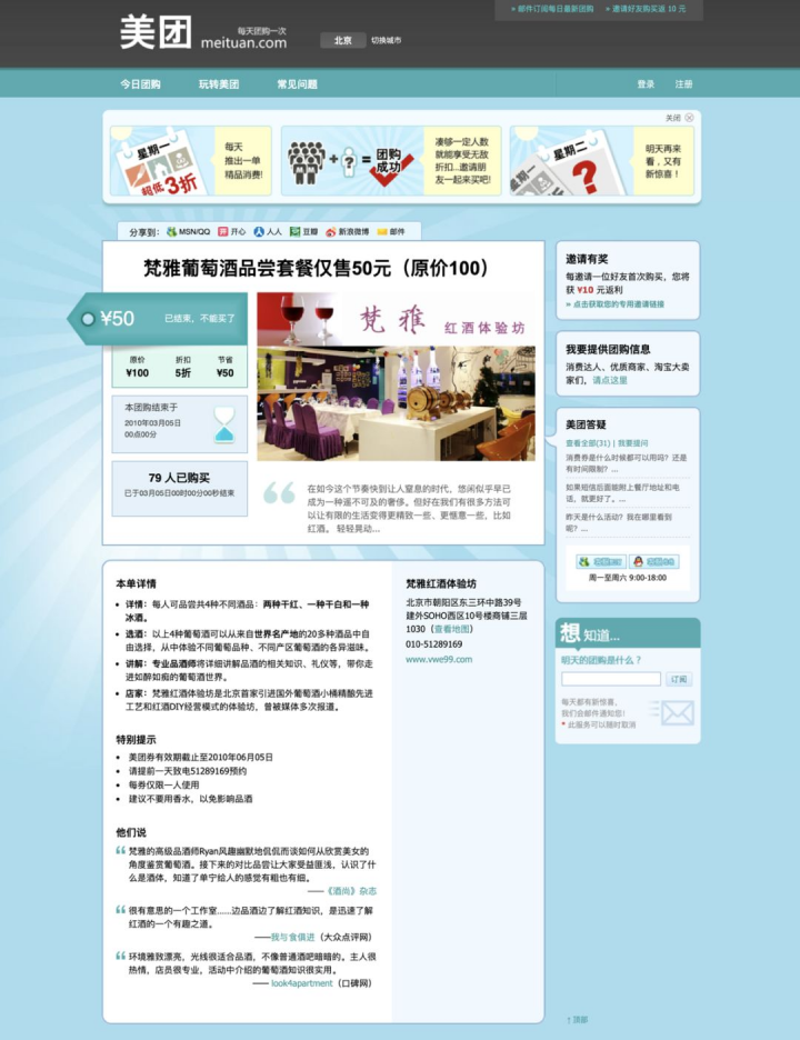 平臺上線后推出的第一個產(chǎn)品是葡萄酒品嘗套餐,對折的直白誘惑迅速帶來第一桶金,當(dāng)天銷售79單,銷售額近4000元,美團(tuán)團(tuán)購也在初出茅廬時就和省錢捆綁在了一起。