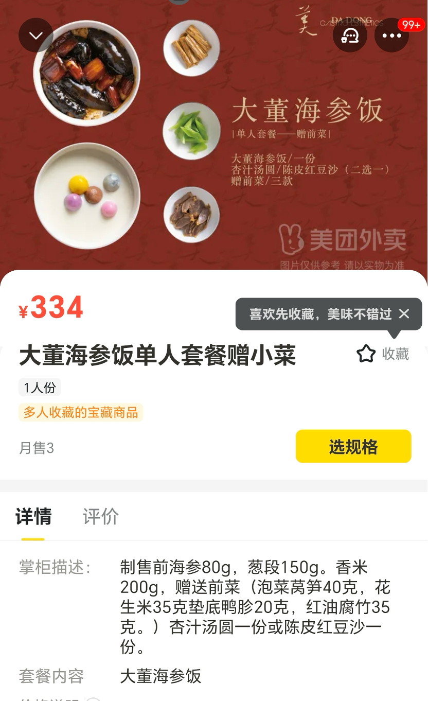 美·大董海參店是北京今年唯一入選黑珍珠三鉆的餐廳,堂食人均價(jià)格為800元,外賣菜單里有為外賣渠道定制的大董海參飯單人餐(334元)、一人食董式燒茄子臘肉筍衣飯(78元)、一人食宮保雞丁蠶豆飯(78元)等單人套餐?绝啞⒒ǖ褴饺卣舻弁跣、葵花雞飯等招牌菜則未出現(xiàn)在外賣列表中。不過,該店外賣銷售量最高的是16元一份的透亮素包子。