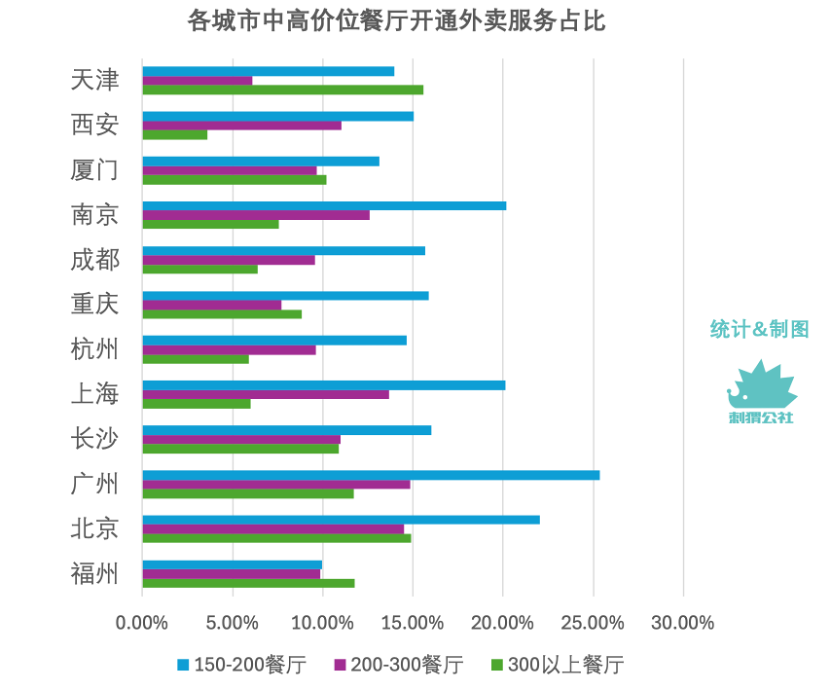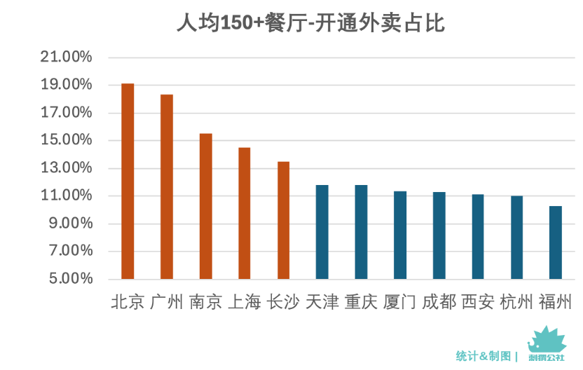 按城市分布來看,北京、廣州、上海、南京的貴價(jià)餐飲外賣開通比例顯著高于統(tǒng)計(jì)范圍內(nèi)的其他城市。