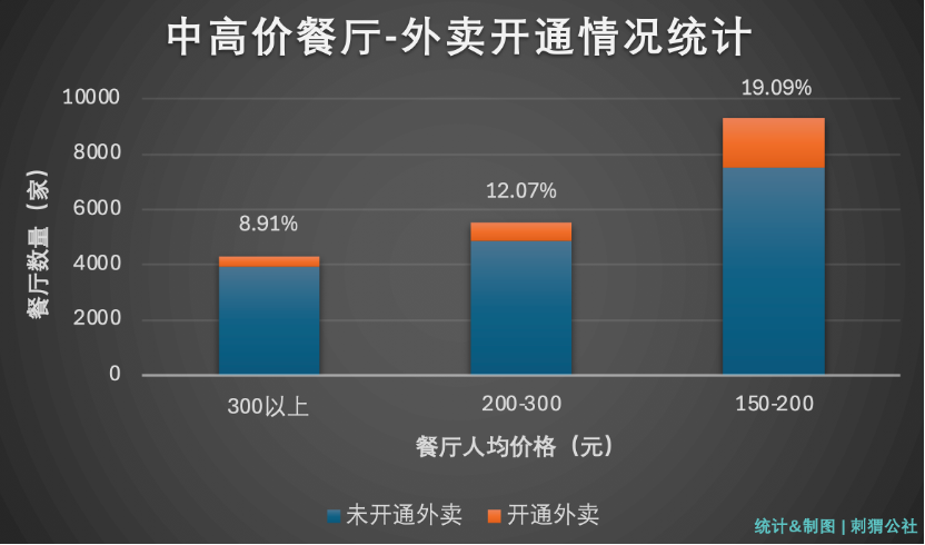 黑珍珠餐廳的數(shù)據(jù)樣本量較小,我們錨定全國12個(gè)城市,對(duì)人均價(jià)格超過150元的19151家餐廳進(jìn)行數(shù)據(jù)統(tǒng)計(jì)和分析,發(fā)現(xiàn)其中已開通外賣的餐廳占比為14.77%。其中,人均300+餐廳開通外賣占比為8.91%,人均200-300餐廳開通外賣占比為12.07%,人均150-200餐廳開通外賣占比為19.09%。