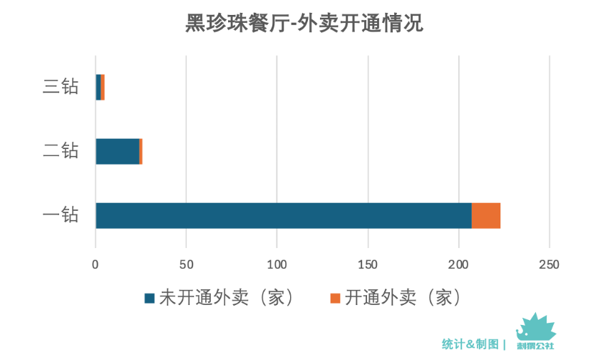 而一個(gè)反直覺的結(jié)論是,論開通外賣的滲透占比,黑珍珠三鉆餐廳(40%)大于二鉆餐廳(7.69%),二鉆餐廳又大于一鉆餐廳(7.17%)?赡苁且?yàn)槎⑷@餐廳整體數(shù)量較少,統(tǒng)計(jì)結(jié)果受單個(gè)餐廳影響較大;另一個(gè)原因是二三鉆餐廳多分布在一線城市,而一線城市高端餐飲開通外賣的比例又高于二三線城市,這一地域分布特征我們將在第二部分詳細(xì)討論。