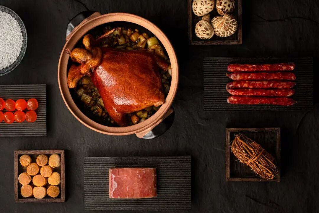“脆皮糯米雞”正是彩豐樓中餐廳的一道代表性菜品。其甄選七八個月大的清遠(yuǎn)雞去骨,把有瑤柱、冬菇等八寶的糯米飯釀入其中,油淋至脆皮。更吸引人的是廚師的現(xiàn)場操作——在包房中,廚師專心操作,在鋪滿香蔥的砂鍋中淋上玫瑰露酒激發(fā)香氣,九刀堂剪后分給食客。工作人員同步講述制作秘訣與食材故事,讓顧客邊看邊品,感受匠心。