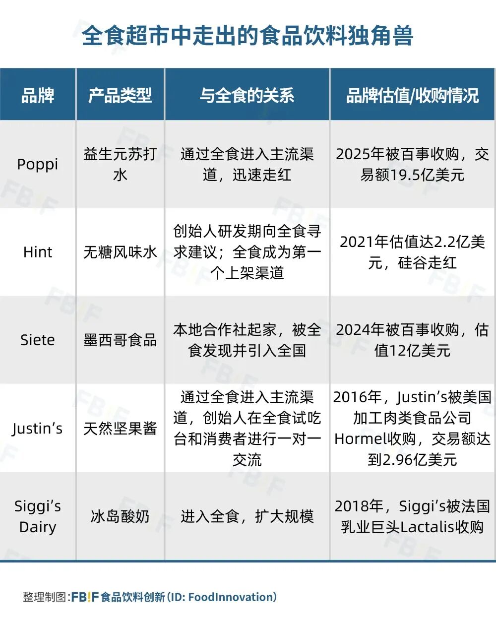 據(jù)FBIF不完全統(tǒng)計(jì),從Poppi到Hint,再?gòu)腏ustin’s到Siggi’s Dairy,至少有5個(gè)獨(dú)角獸品牌,它們自初創(chuàng)階段進(jìn)入全食超市。這些品牌借此走進(jìn)大眾視野,在獲得高估值后,可能會(huì)被食品巨頭收購(gòu),開(kāi)啟全球化的發(fā)展路徑。