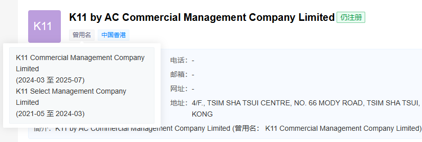 天眼查顯示,K11 by AC集團(tuán)全稱為K11 by AC Commercial Management Company Limited,原名為K11 Commercial Management Company Limited,于2021年在香港成立。