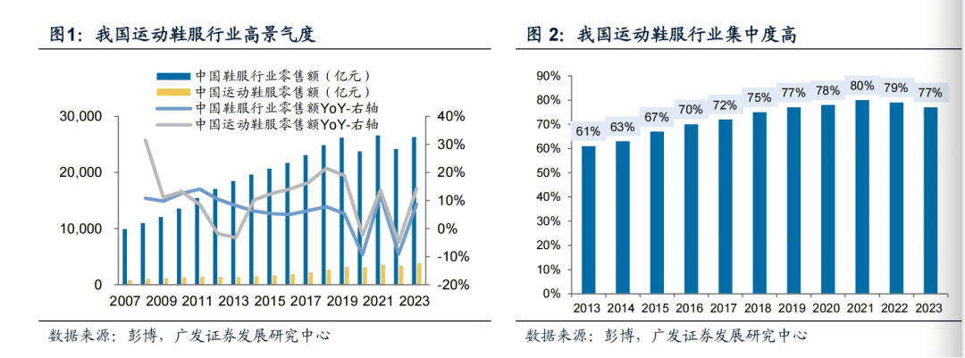 所謂的“逆風(fēng)”,指的是行業(yè)環(huán)境和國產(chǎn)運服競爭角色的變化。告別過去十年的中高位數(shù)增長,2024年國內(nèi)運動鞋服市場同比增長僅5.9%,但行業(yè) CR5 保持在70%上下。