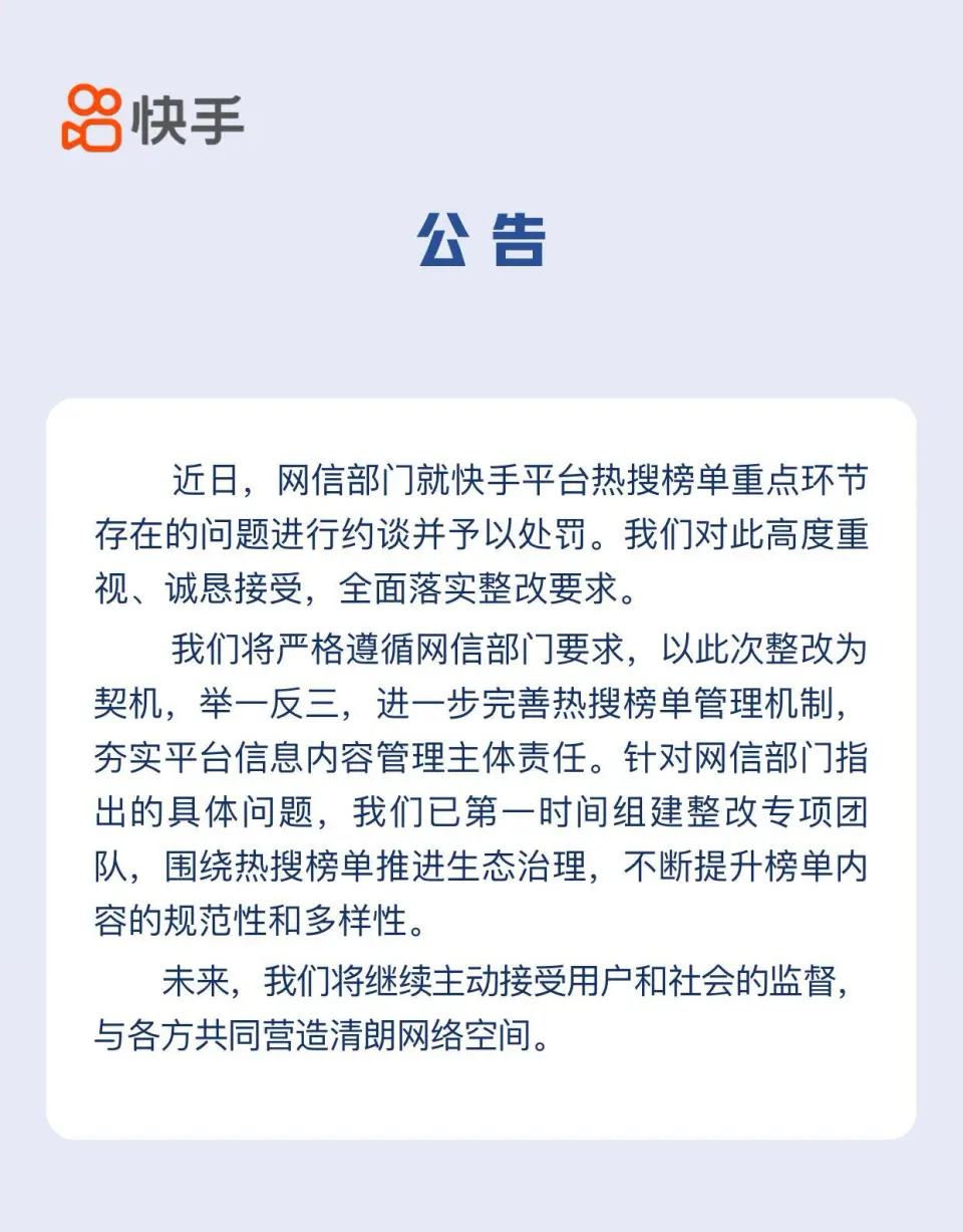9月20日,快手治理公告發(fā)文表示,近日,網(wǎng)信部門就快手平臺(tái)熱搜榜單重點(diǎn)環(huán)節(jié)存在的問題進(jìn)行約談并予以處罰。快手對(duì)此高度重視、誠懇接受,全面落實(shí)整改要求。將嚴(yán)格遵循網(wǎng)信部門要求,以此次整改契機(jī),舉一反三,進(jìn)一步完善熱搜榜單管理機(jī)制夯實(shí)平臺(tái)信息內(nèi)容管理主體責(zé)任。