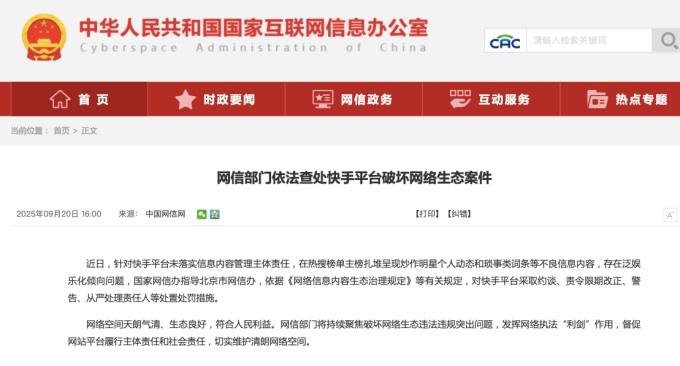 9月20日,中國網(wǎng)信網(wǎng)連續(xù)發(fā)布《網(wǎng)信部門依法查處微博平臺(tái)破壞網(wǎng)絡(luò)生態(tài)案件》、《網(wǎng)信部門依法查處快手平臺(tái)破壞網(wǎng)絡(luò)生態(tài)案件》兩篇要聞。