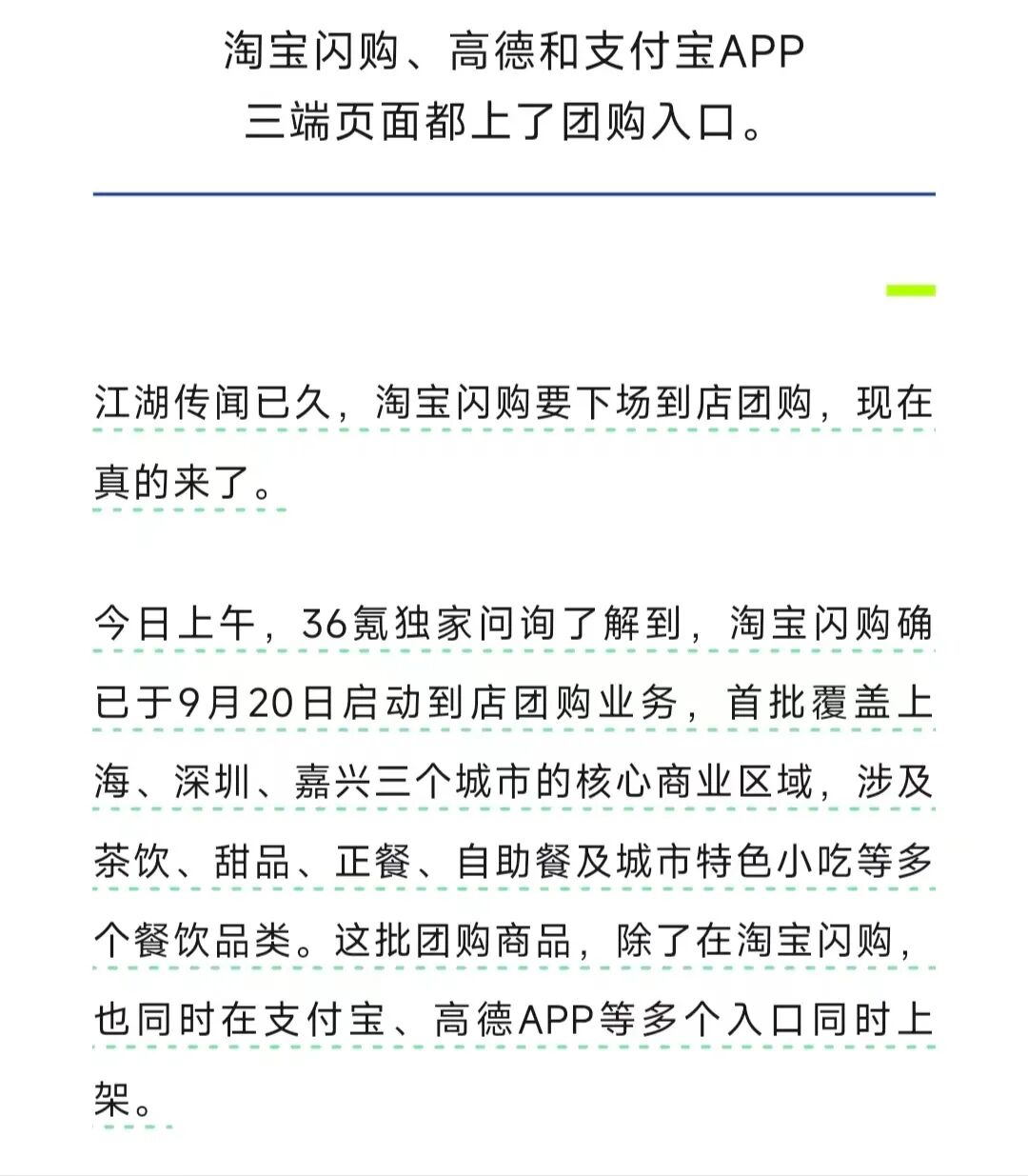 業(yè)內(nèi)相關(guān)消息透露,9月20日上午,淘寶閃購(gòu)正式啟動(dòng)到店團(tuán)購(gòu)業(yè)務(wù),首批覆蓋上海、深圳、嘉興三個(gè)城市的核心商業(yè)區(qū)域,后續(xù)再擴(kuò)展至全國(guó)50多個(gè)一二線城市。