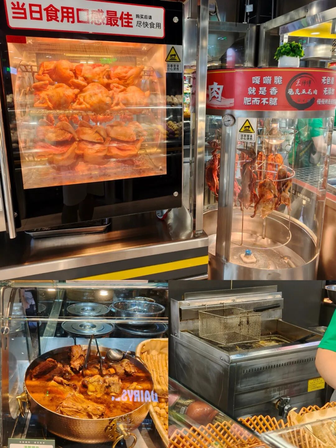 除了自營(yíng)大單品,食品區(qū)也通過陳列設(shè)計(jì)凸顯商品新鮮度與專業(yè)性:尤其是熱廚鮮食區(qū)域均采用暖光燈陳列,烤雞烤爐、烤鴨烤架持續(xù)旋轉(zhuǎn)烤制,旁側(cè)懸掛著剛出爐的烤鴨與烤雞;消費(fèi)者挑選炸物時(shí),工作人員還會(huì)在現(xiàn)場(chǎng)操作間進(jìn)行簡(jiǎn)單復(fù)炸后再打包。