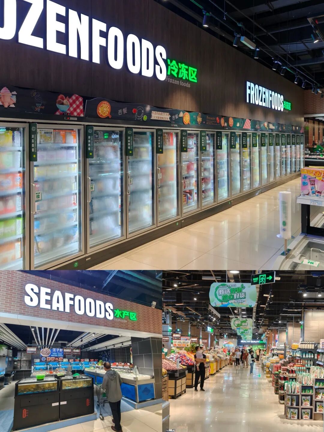 一進(jìn)入店內(nèi),筆者就發(fā)現(xiàn)信譽(yù)樓超市使用了更明亮的暖光燈,這幾乎是新商超的運(yùn)營(yíng)標(biāo)配;入口處一整排明亮的凍品冰柜,還有不同分區(qū)門頭所用的明亮招牌,更是凸顯信譽(yù)樓超市運(yùn)營(yíng)設(shè)計(jì)的新鮮感。