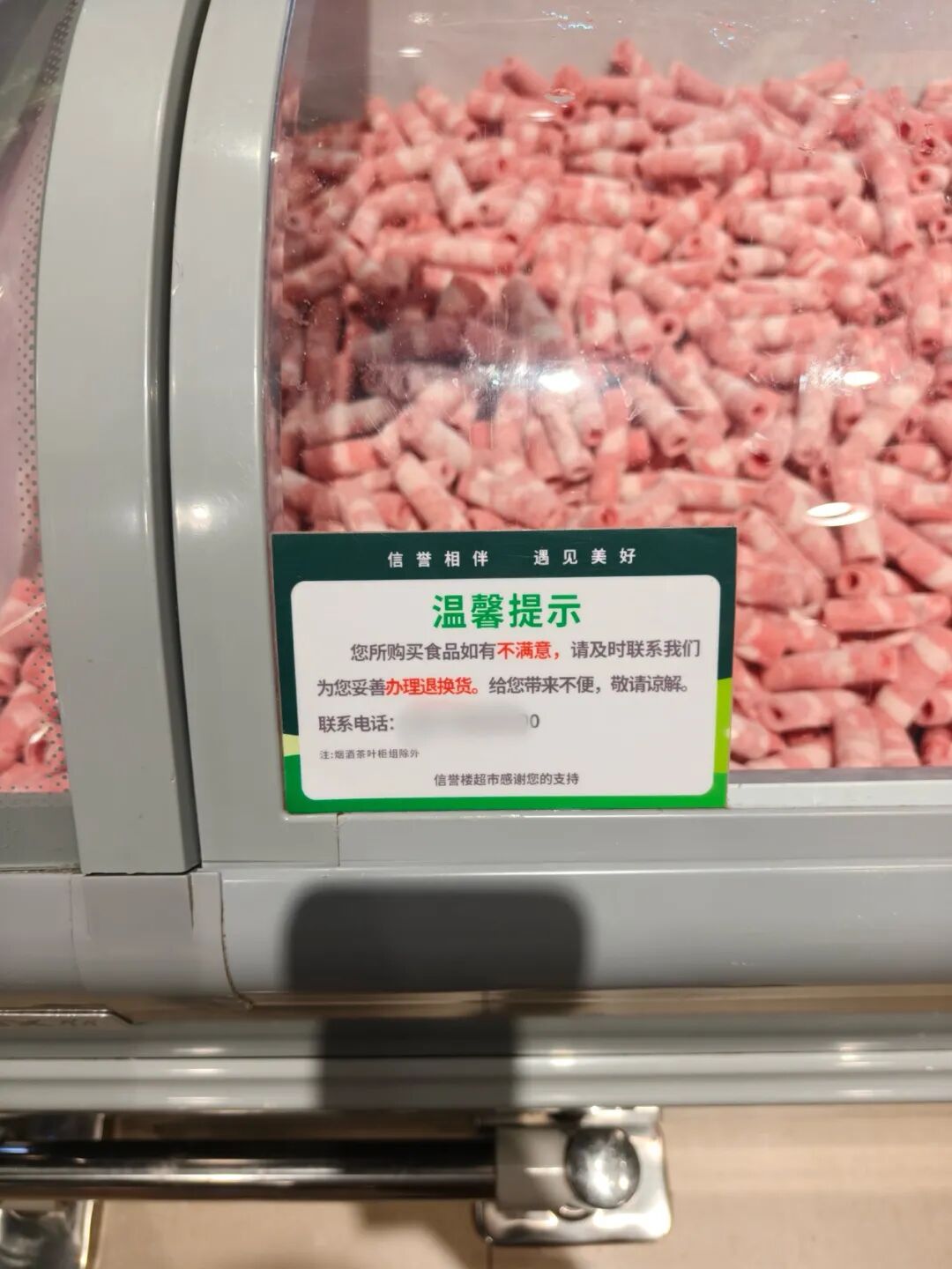 走進(jìn)如今的信譽(yù)樓,服務(wù)理念仍在細(xì)節(jié)中落地:熟食區(qū)柜臺(tái)顯眼處標(biāo)注“您所購(gòu)買的食品如有不滿,可聯(lián)系我們辦理退換貨”及聯(lián)系電話,上方則輔以“信譽(yù)相伴、遇見美好”的標(biāo)語。