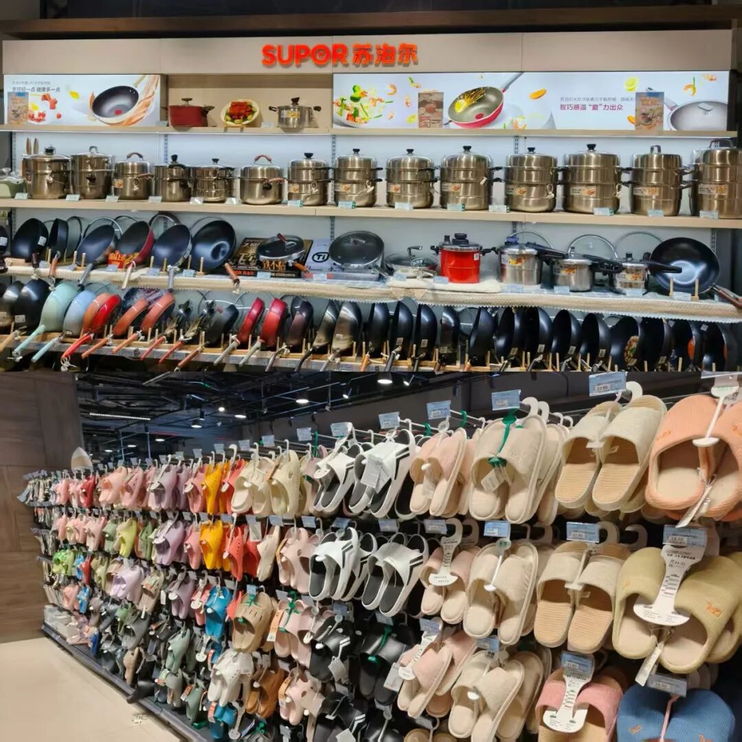 以信譽(yù)樓為例,其超市內(nèi)仍有大面積貨架陳列拖鞋、廚具炊具、掃把拖把等低頻購(gòu)買的生活用品。