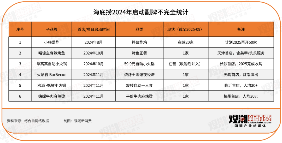 “紅石榴計劃”下,海底撈接連推出了小嗨愛炸、喵塘主麻辣烤魚、舉高高自助小火鍋、火焰宮BarBecue、沸派·甄鮮小火鍋、嗨妮牛肉麻辣燙等6個子品牌,其中舉高高自助小火鍋為收購而來。