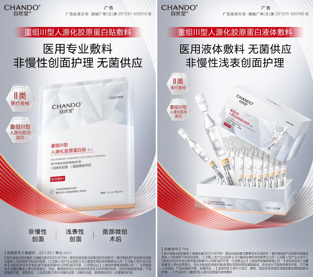 不久前,自然堂宣布推出了兩款械字號新品——重組Ⅲ型人源化膠原蛋白貼敷料與液體敷料。