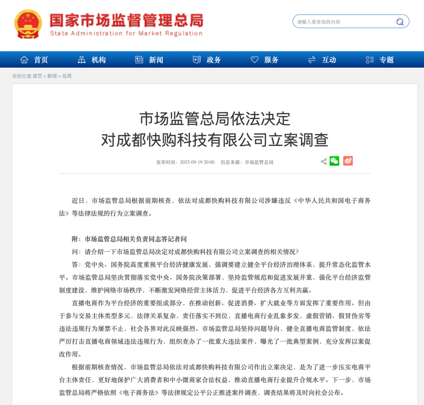 9月19日晚,國家市場監(jiān)管總局發(fā)布公告,宣布依法對快手旗下電商子公司成都快購科技有限公司涉嫌違反《中華人民共和國電子商務(wù)法》等法律法規(guī)的行為立案調(diào)查。