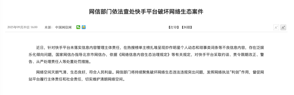 公告顯示,近日,針對快手平臺未落實信息內(nèi)容管理主體責(zé)任,在熱搜榜單主榜扎堆呈現(xiàn)炒作明星個人動態(tài)和瑣事類詞條等不良信息內(nèi)容,存在泛娛樂化傾向問題,國家網(wǎng)信辦指導(dǎo)北京市網(wǎng)信辦,依據(jù)《網(wǎng)絡(luò)信息內(nèi)容生態(tài)治理規(guī)定》等有關(guān)規(guī)定,對快手平臺采取約談、責(zé)令限期改正、警告、從嚴(yán)處理責(zé)任人等處置處罰措施。